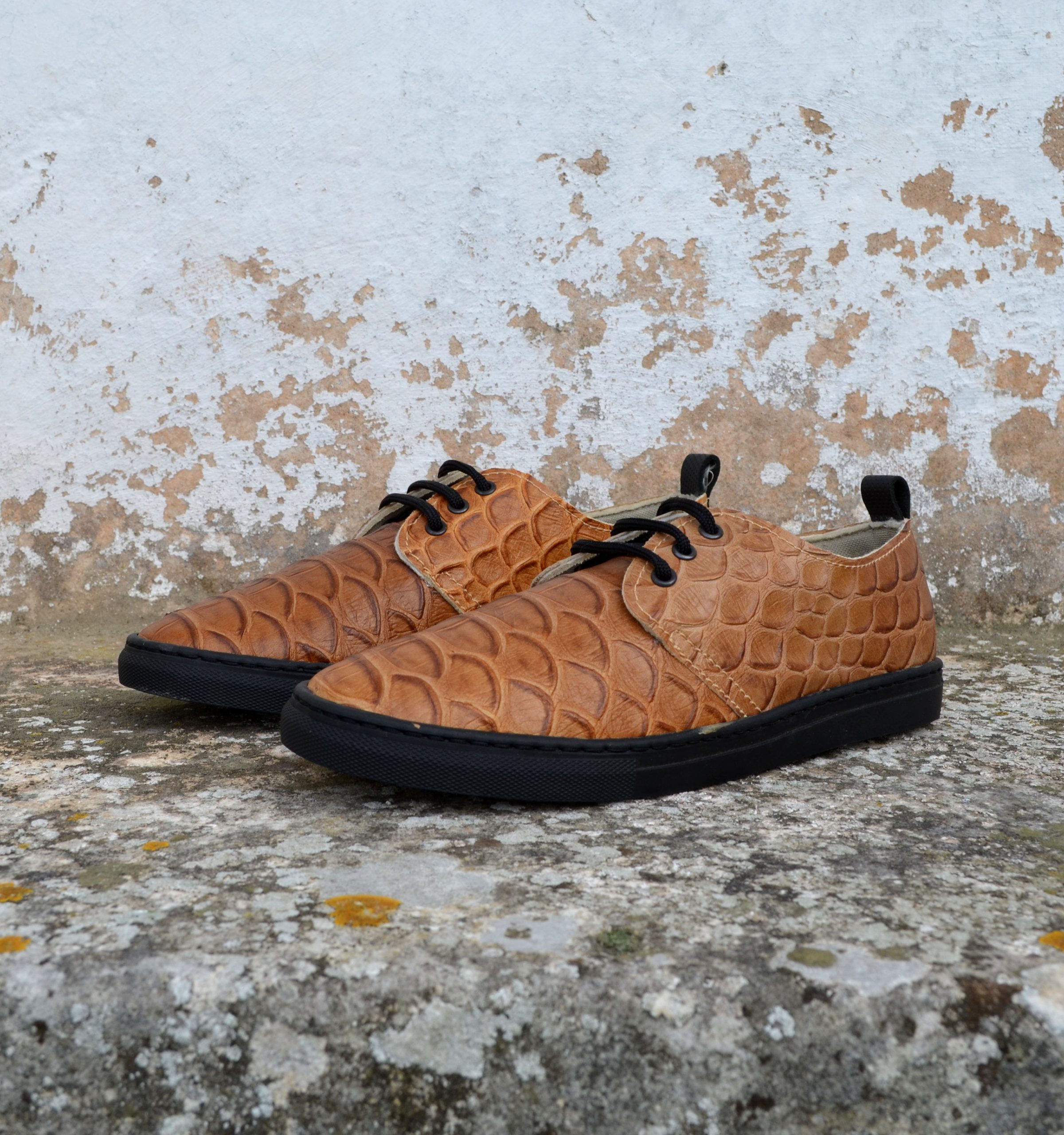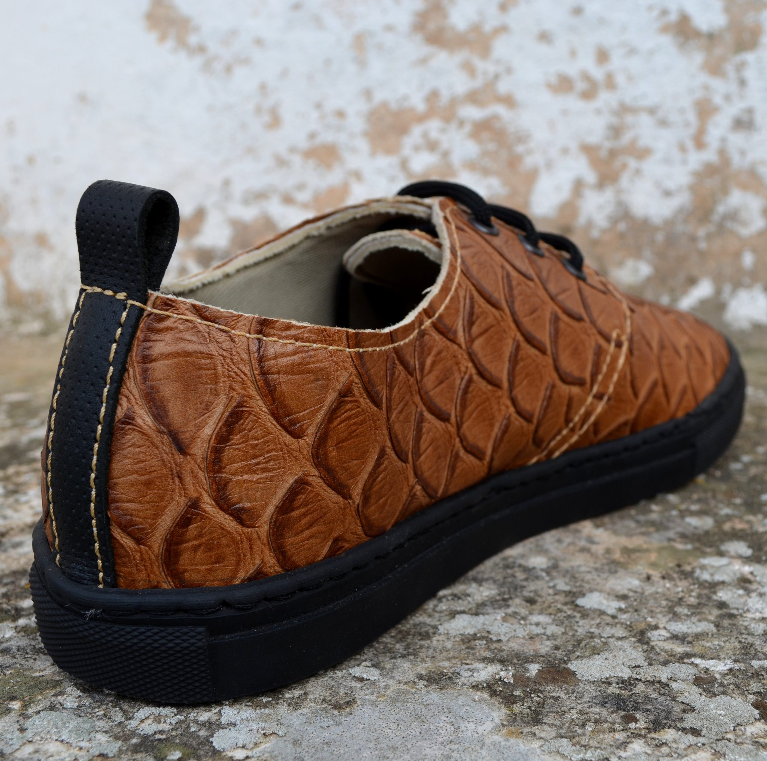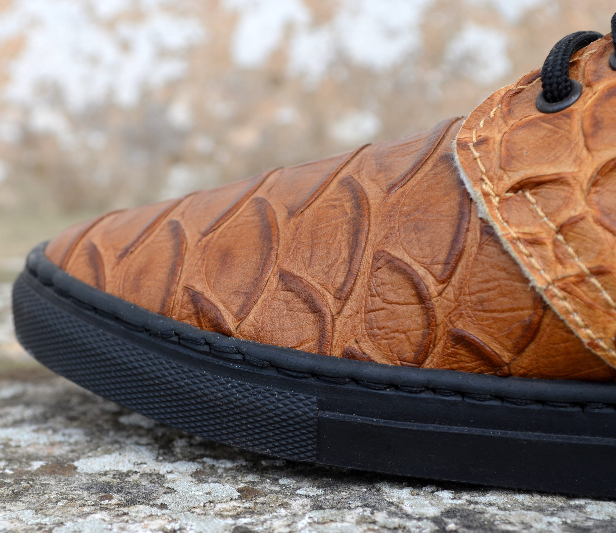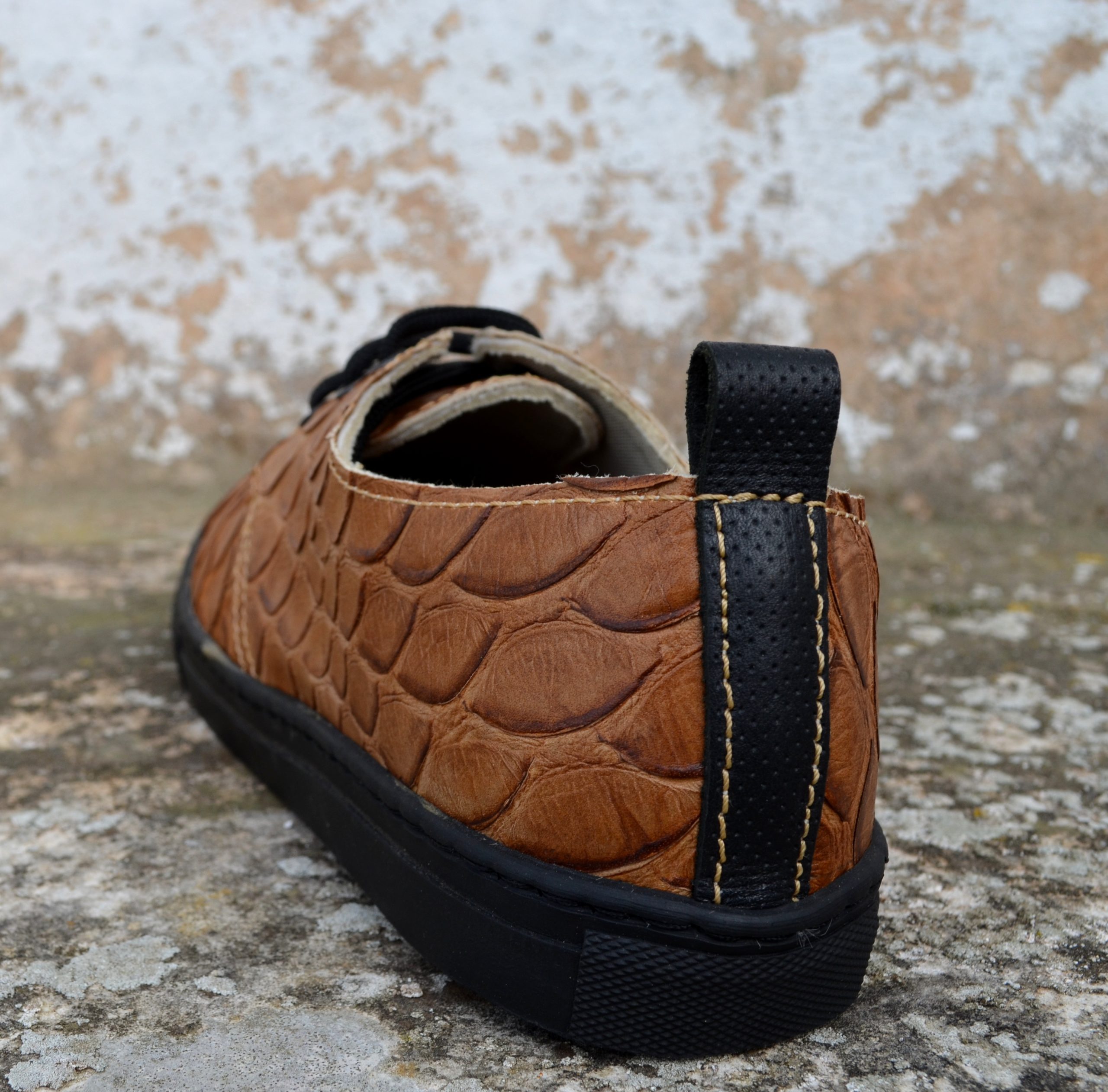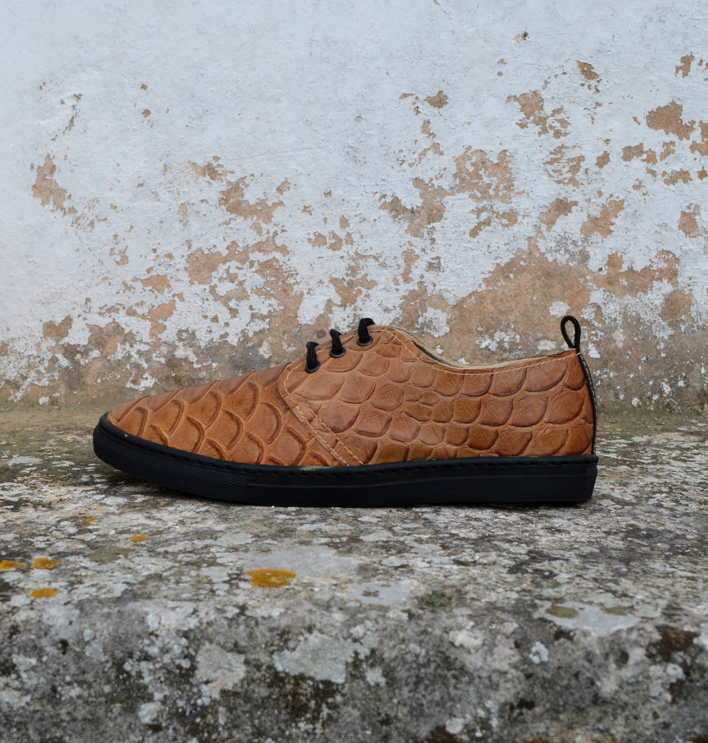 Tênis em pele com padrão e relevo croc.